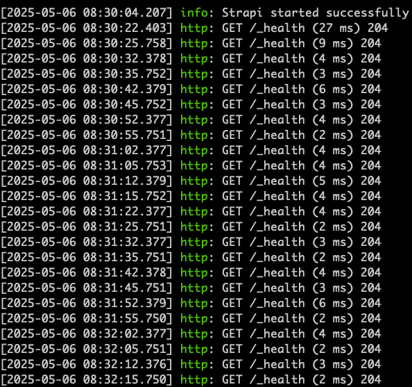 $ kubectl logs strapi-prod-66cb7494c5-abcde -n default [2025-05-07 10:15:23.456] INFO: Server started on port 1337 [2025-05-07 10:15:23.567] INFO: Database connection established [2025-05-07 10:15:23.678] INFO: Admin panel available at /admin